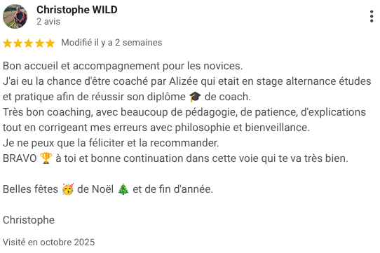 ⭐⭐⭐⭐⭐ "Bon accueil et accompagnement pour les novices. Très bon coaching avec beaucoup de pédagogie, de patience et bienveillance. Je recommande vivement ! BRAVO 🏆 à toi Alizée."