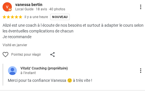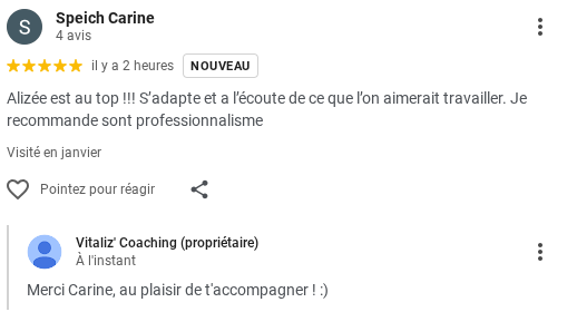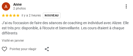 ⭐⭐⭐⭐⭐ "J'ai eu l'occasion de faire des séances de coaching en individuel avec Alizée. Elle est très pro, disponible, à l'écoute et bienveillante. Les cours étaient à chaque fois différents."