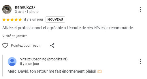 ⭐⭐⭐⭐⭐ "Alizée et professionnel et agréable à l'écoute de ces élèves je recommande"